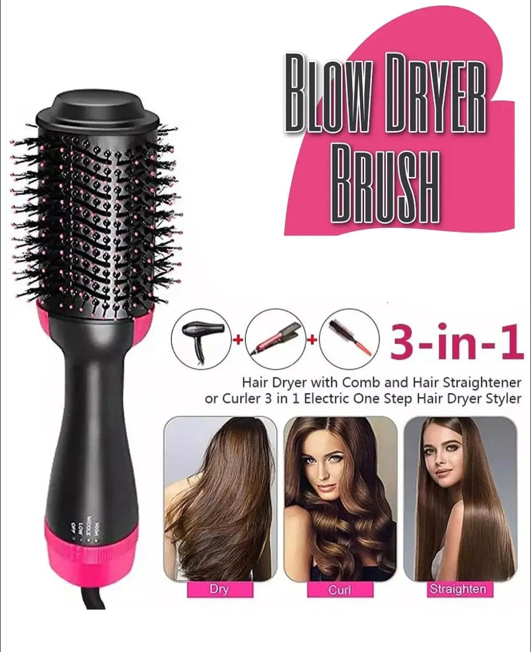 The 3‑in‑1 Hair Dryer Brush – One‑Step Volumizer & Styler is the ultimate tool for effortless hair styling. Combining a dryer, straightener, and curler in one, it saves time while delivering salon‑style results at home. The professional hot air brush adds volume, smoothness, and shine, while reducing frizz for a polished finish.