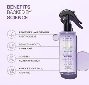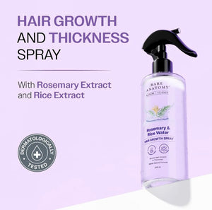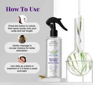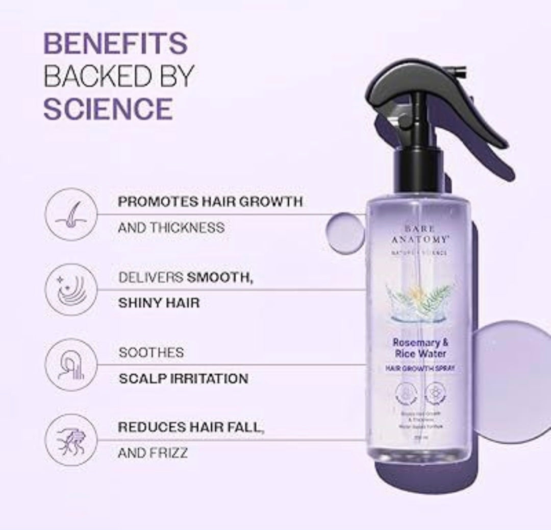 Bare Anatomy Rosemary & Rice Water Hair Growth Spray is a premium hair care solution designed to strengthen your hair from root to tip. Enriched with natural rosemary extracts and rice water, this spray helps reduce hair fall, improve volume, and add shine for healthier, fuller hair. Lightweight and non-greasy, it can be easily incorporated into your daily hair care routine.